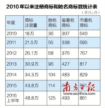 日前,根据国家工商总局数据显示,广州市共有注册商标48.8万件,较2010年的18万件增长了2.56倍,占全省注册商标总数的近三成,居全国副省级城市和计划单列市首位。值得一提的是,2014年以来,广州市注册商标数量呈现加快增长态势。