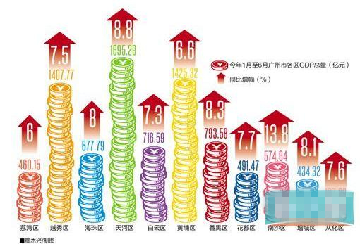 记者梳理发现,今年上半年广州各区的GDP总量都比去年同期有所增长,其中天河区GDP增长总量最大,增加了127.16亿元;从化区增长总量最小,只有6.92亿元。